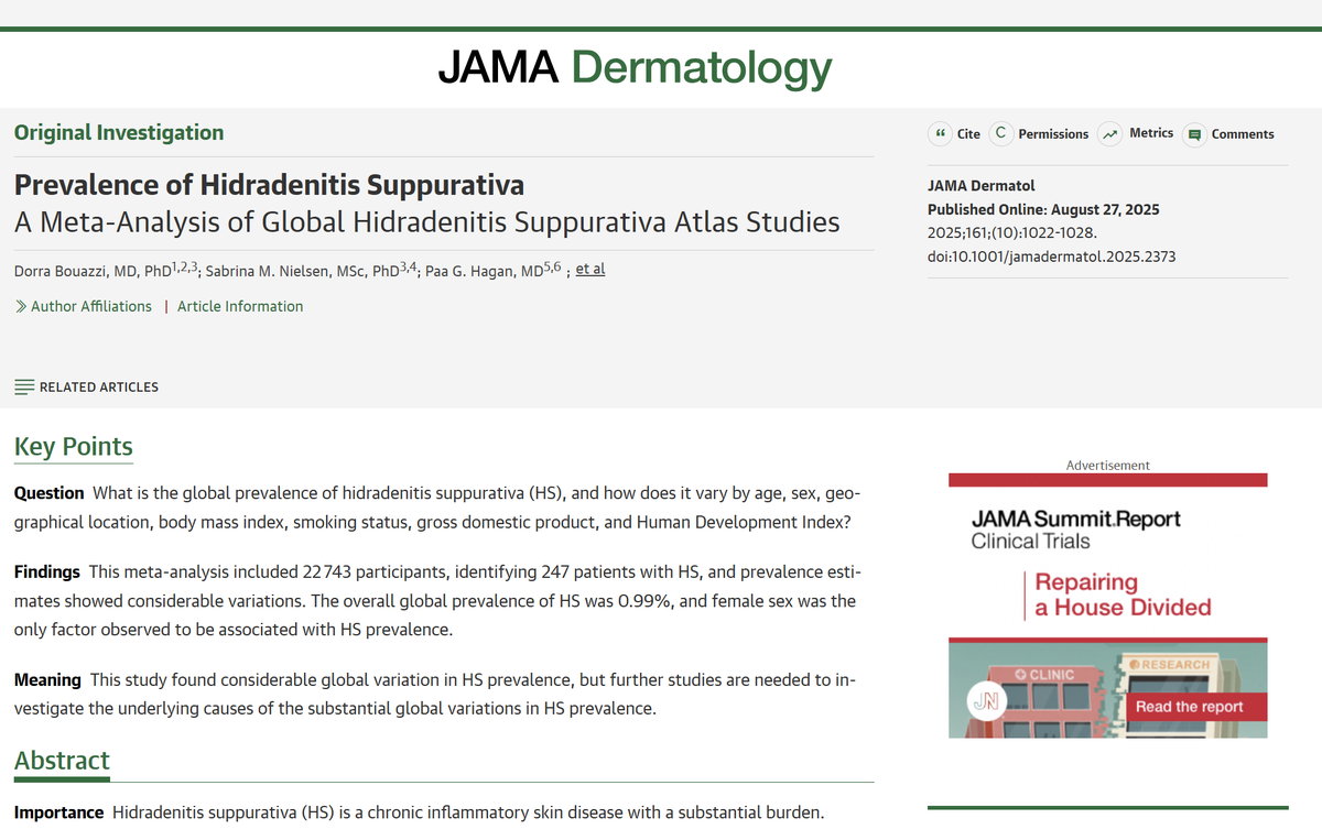 A landmark global study has revealed that hidradenitis suppurativa (HS), a painful, scarring inflammatory skin disease that affects around 1% of the world’s population, or roughly one in every 100 people. This places HS among the more common chronic inflammatory conditions worldwide, occurring as frequently as rheumatoid arthritis (RA), which has an estimated prevalence of 0.5–1.0%.