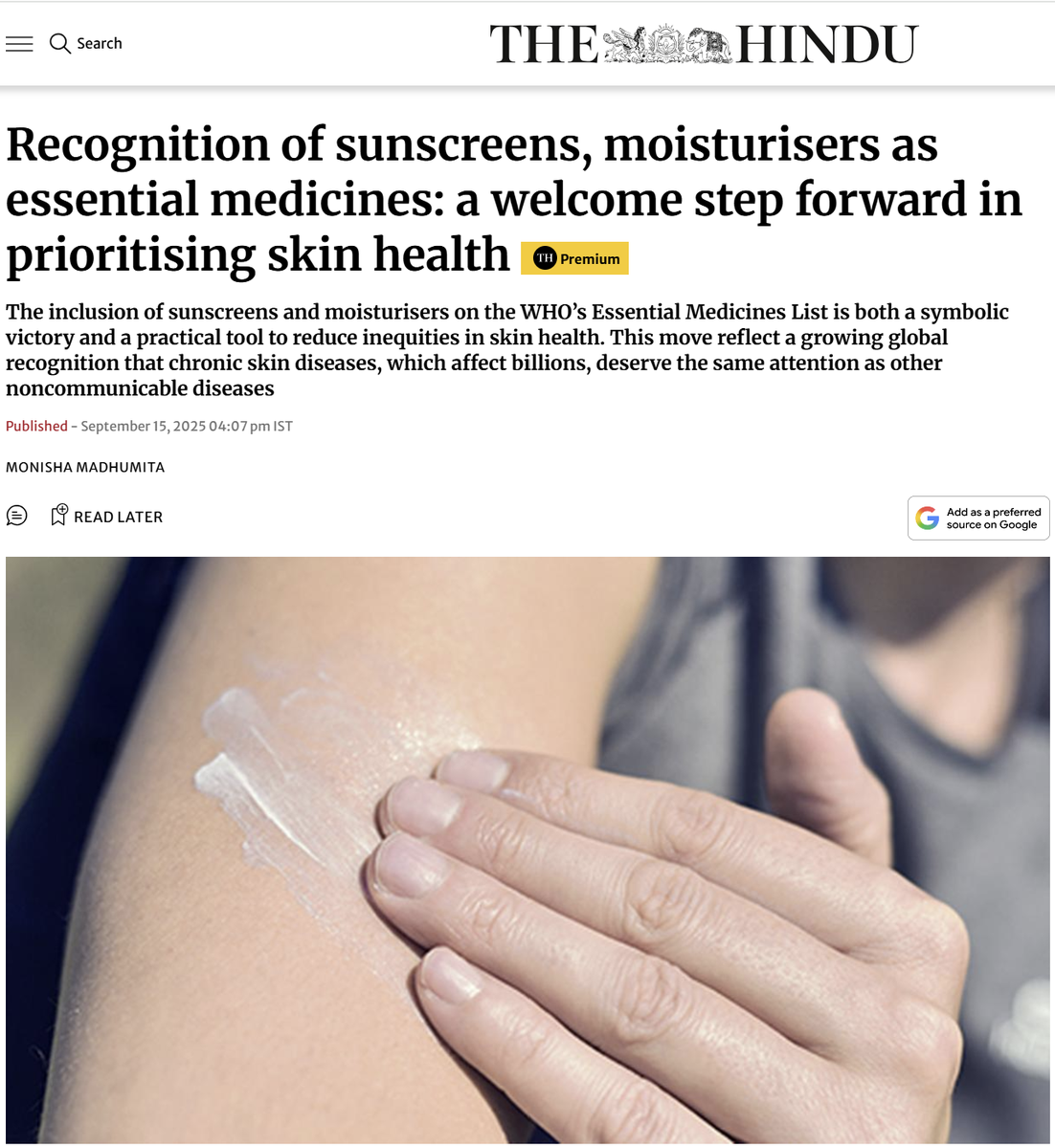 The Hindu recognised the inclusion of sunscreens and moisturisers as essential medicines as a “welcome step forward” for skin health worldwide.